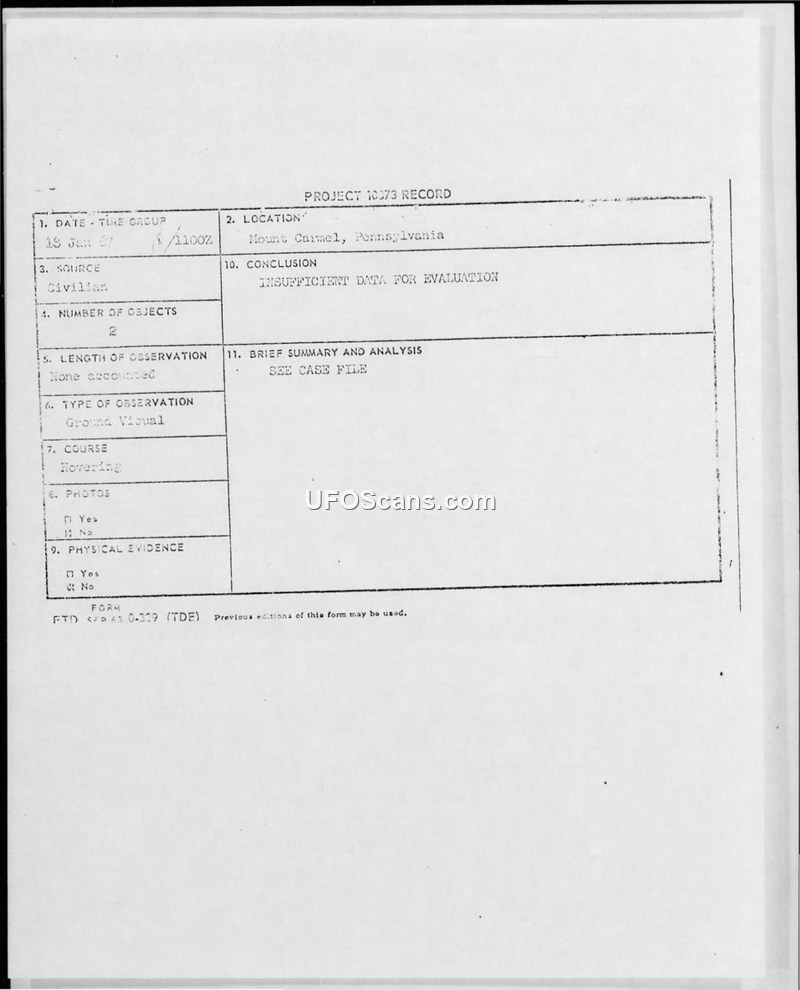 Project 10073 Record — Mount Carmel, Pennsylvania, 18 January 1967