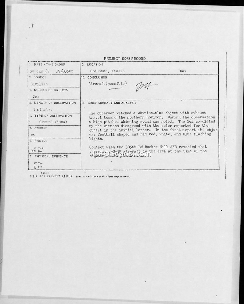 Project 10073 Record — Columbus, Kansas, 18 January 1967
