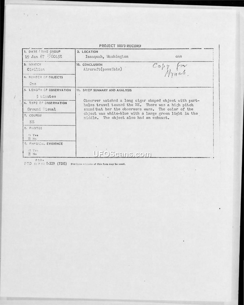 Project 10073 Record — Issaquah, Washington, 19 January 1967