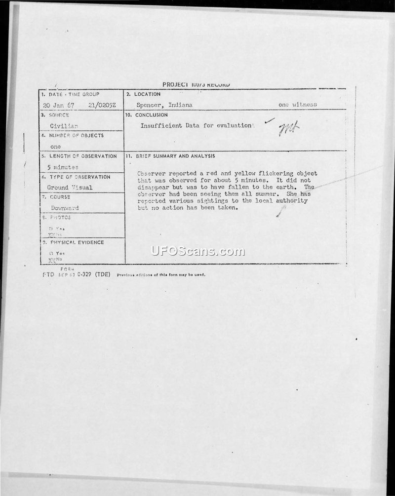 A civilian report of a red and yellow flickering object in Spencer, Indiana, on January 20, 1967. The Air Force concluded there was insufficient data for evaluation and noted the witness was considered unreliable.