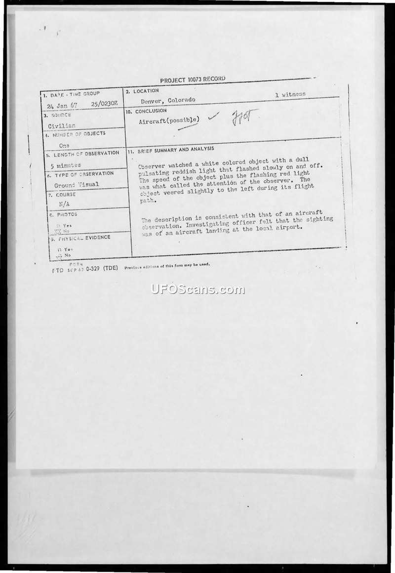 A civilian reported a round, pulsating red-and-white light over Denver on January 24, 1967. The Air Force investigation concluded the object was likely an aircraft landing at Stapleton Airfield.