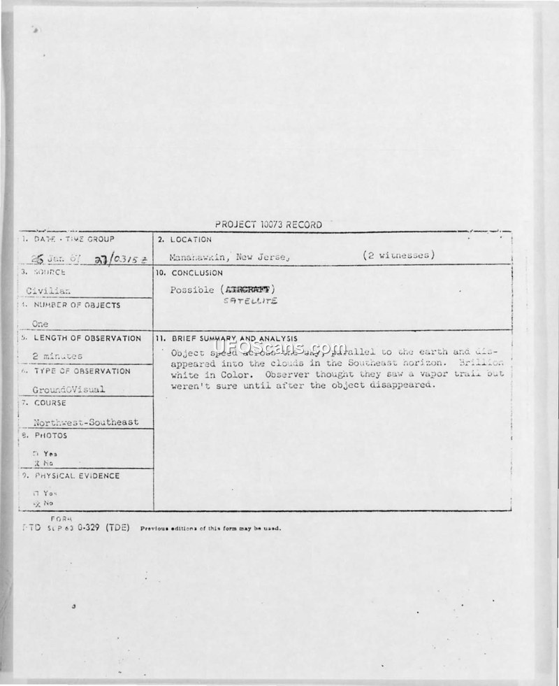 A civilian witness reported a brilliant, high-speed, silent aerial object in Manahawkin, New Jersey, on January 26, 1967. The Air Force investigated the report under Project 10073 but concluded the data was insufficient for a definitive evaluation.
