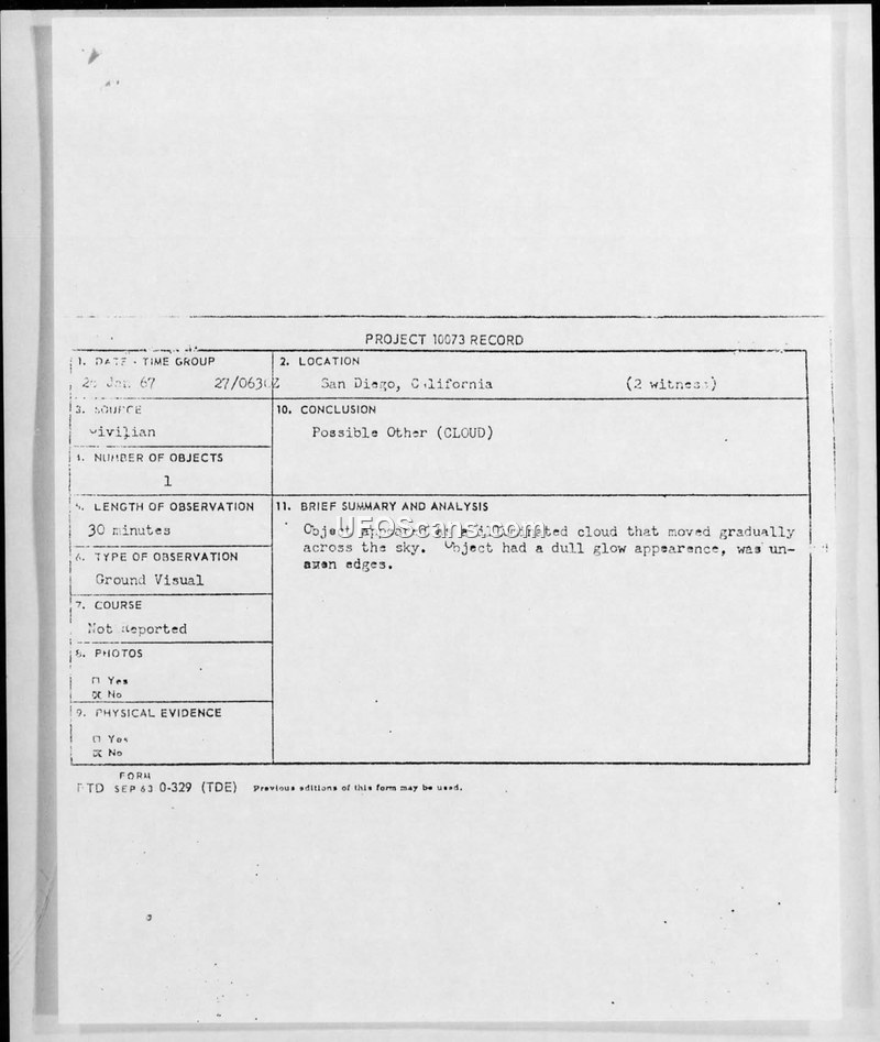 Project 10073 Record: UFO Sighting Report - San Diego, California, January 1967