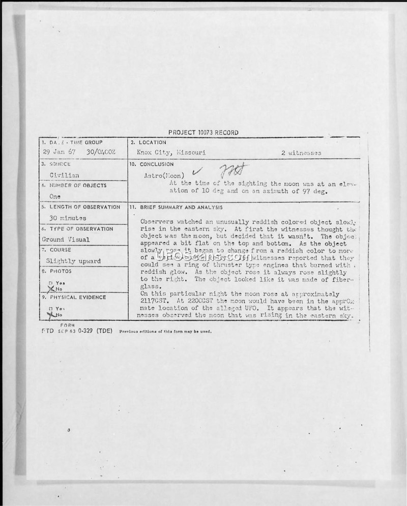 PROJECT 10073 RECORD - Knox City, Missouri - 29 Jan 67