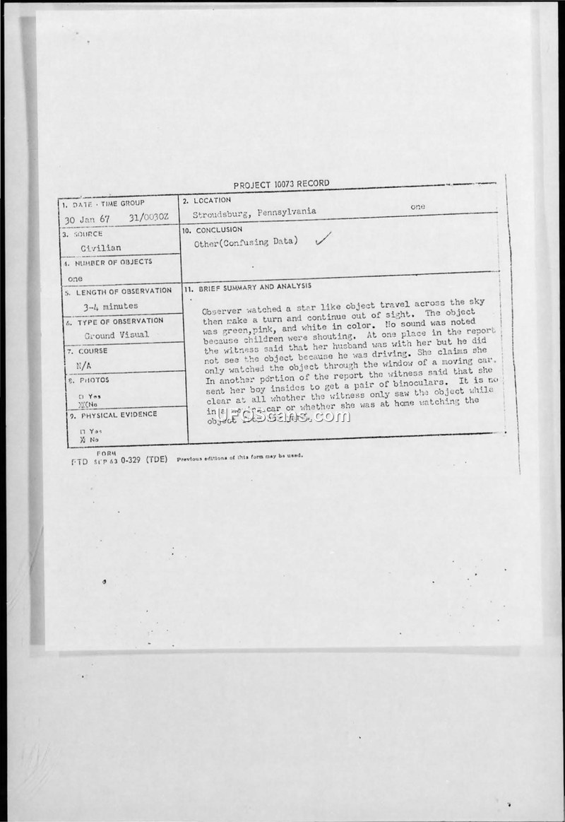 Project 10073 Record — Stroudsburg, Pennsylvania, 30 Jan 67