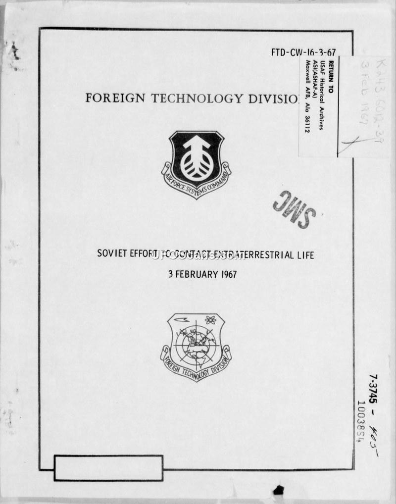 This intelligence report from the Foreign Technology Division, dated February 3, 1967, provides a comprehensive review of Soviet scientific efforts concerning the search for extraterrestrial civilizations. The document highlights that while Soviet materialistic philosophy is inherently compatible with the existence of extraterrestrial life, the scientific community in the USSR remains divided on the practicalities of establishing contact. The report identifies the First All-Union Conference on Extraterrestrial Civilizations, held at the Byurakan Observatory in May 1964, as the pivotal event that brought official recognition to the subject within the Soviet Union. Key figures such as I. S. Shklovskiy, N. S. Kardashev, and V. A. Kotel'nikov are identified as central to these discussions. The report details various Soviet theoretical approaches, including Kardashev's energy-based classification of civilizations and the debate over the use of the 21 cm hydrogen wavelength for interstellar communication. Despite the high level of theoretical discourse, the report concludes that there is no evidence of large-scale practical efforts in the USSR to contact or decipher messages from extraterrestrial sources. Instead, research is limited to small-scale projects and observational studies using existing radio telescopes, such as the RT-22 and the Pulkovo radio telescope. The document also notes a recurring theme of sensationalism in some Soviet popular literature, which the scientific establishment, particularly astronomers, actively works to refute. The report emphasizes that the Soviet approach to this problem is characterized by a mix of serious scientific inquiry and a utilitarian focus on the potential technological benefits of developing advanced radio communication methods. It concludes by noting that while the Soviets have the technical capacity to conduct a systematic survey of the sky, they have not yet committed to such a program, and international cooperation remains a possibility for future efforts.