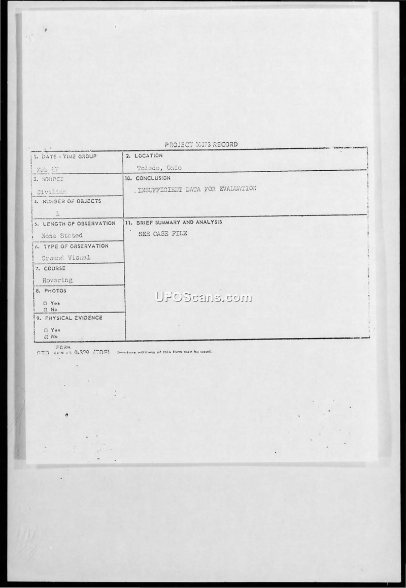 A civilian in Toledo, Ohio, reported a hovering blue-green object with a humming sound in February 1967. The Air Force determined the report lacked sufficient data for a scientific evaluation.