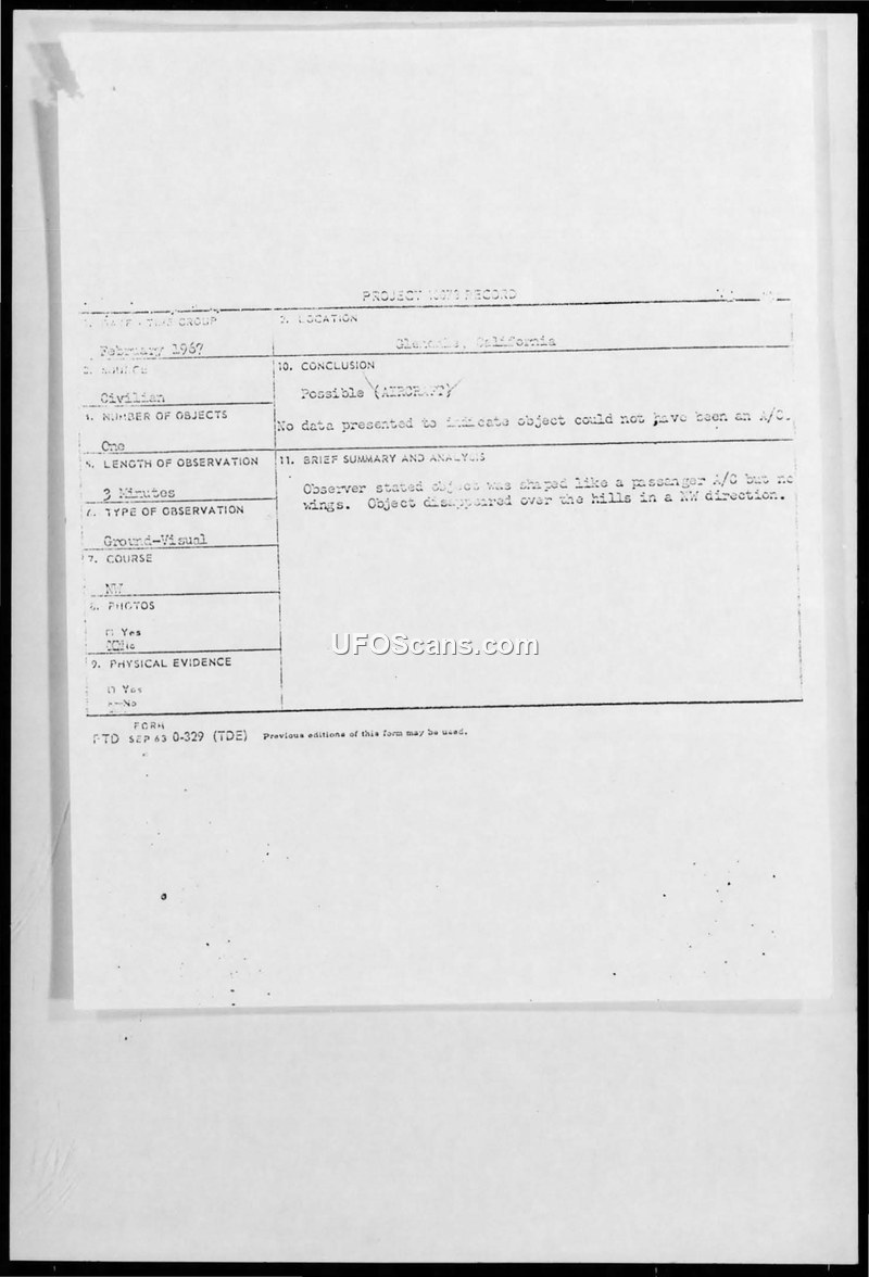 UFO Observation Report — Glendale, California, February 1967