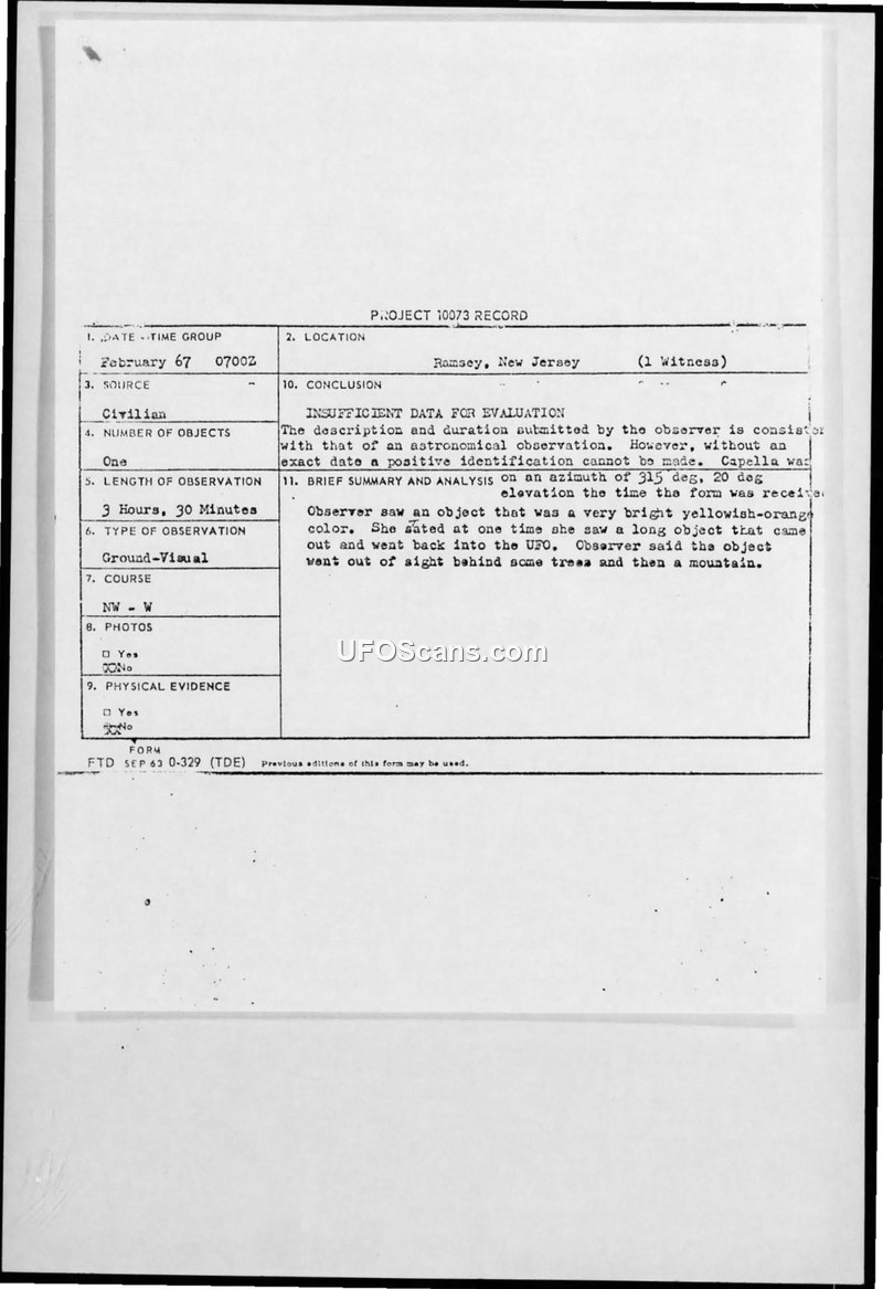 A 17-year-old witness reported a 3.5-hour sighting of a bright yellowish-orange object in Ramsey, New Jersey, in February 1967. The Air Force concluded the description was consistent with the star Capella but deemed the case insufficient data due to the lack of an exact date.