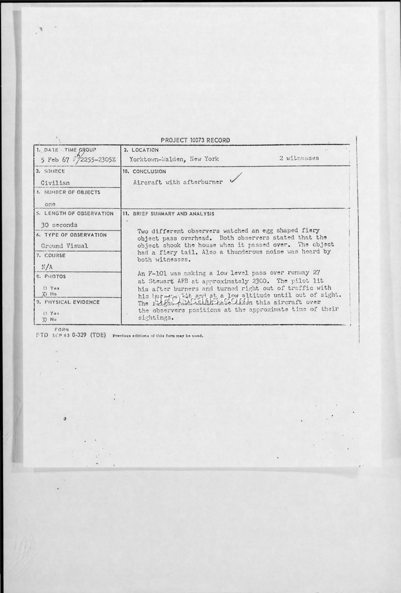 This document is a Project 10073 record detailing a sighting reported by two civilian observers in Yorktown-Walden, New York, on February 5, 1967. The observers reported seeing an egg-shaped, fiery object with a fiery tail passing overhead for approximately 30 seconds. They described the object as white and pink in color, appearing the size of a pea at arm's length, and noted that it produced a 'thunderous noise' and caused their house to shake as it passed. The investigation, conducted by Capt. Stephen Levine, concluded that the phenomenon was an F-101 aircraft. Capt. Levine observed an F-101 making a low-level pass over runway 27 at Stewart AFB at approximately 2300 hours. He noted that the pilot lit the afterburners and executed a right turn out of traffic at a low altitude. The investigator determined that this flight path would have taken the aircraft directly over the observers' positions at the time of their sighting, and he noted that the observers' descriptions matched his own observations of the aircraft perfectly.