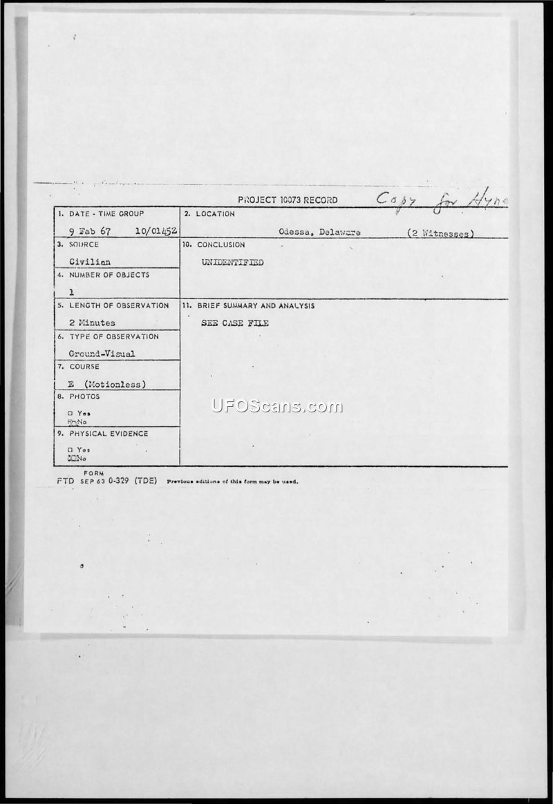 Project 10073 Record — Sighting of 9 February 1967, Odessa, Delaware