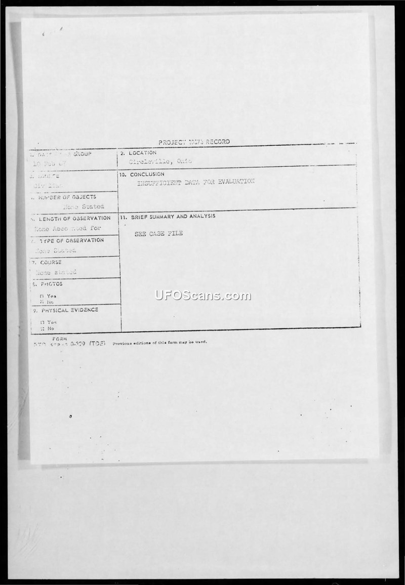 An Air Force investigation into a February 1967 UFO sighting in Circleville, Ohio, concluded that the initial report lacked sufficient data for a scientific evaluation.