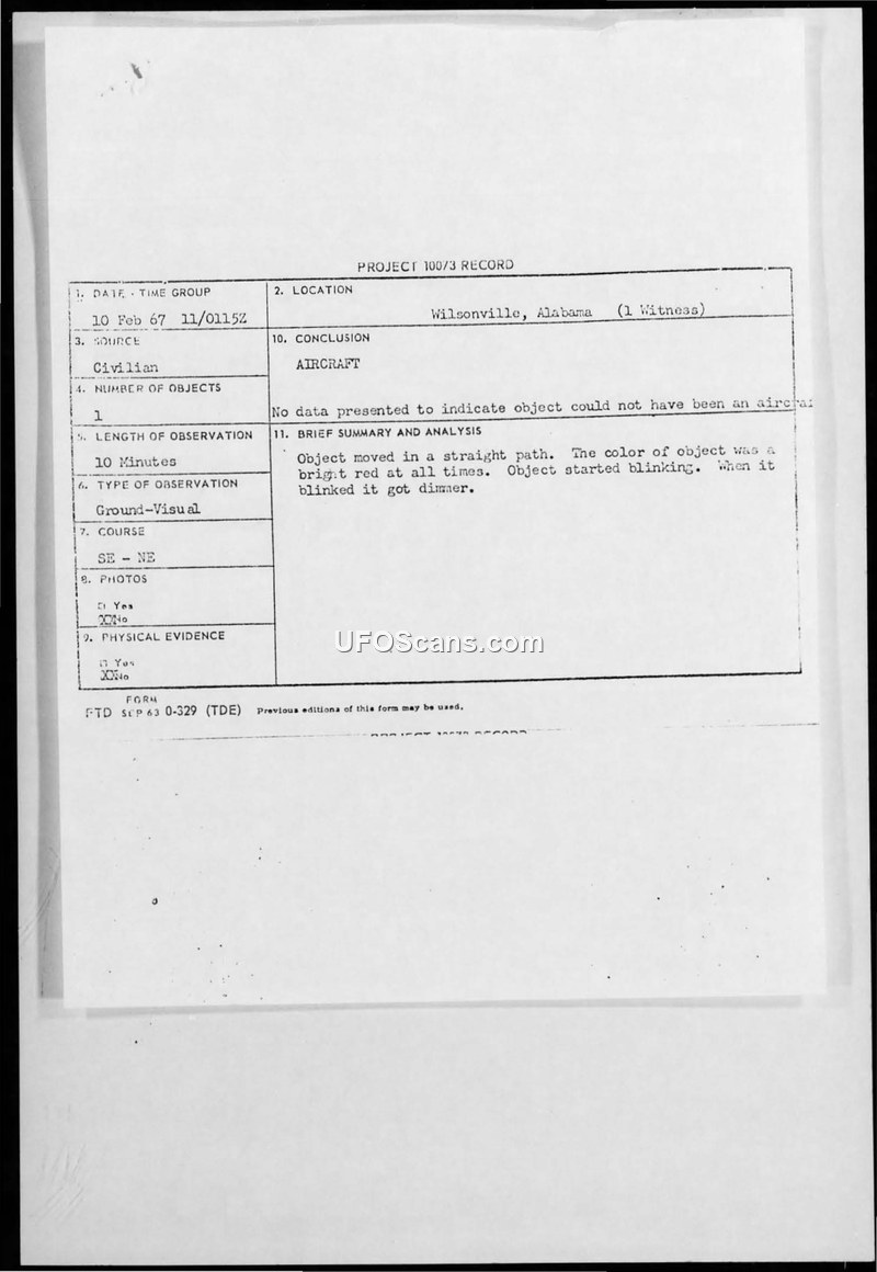 Project 100/3 Record: UFO Observation, 10 Feb 67, Wilsonville, Alabama