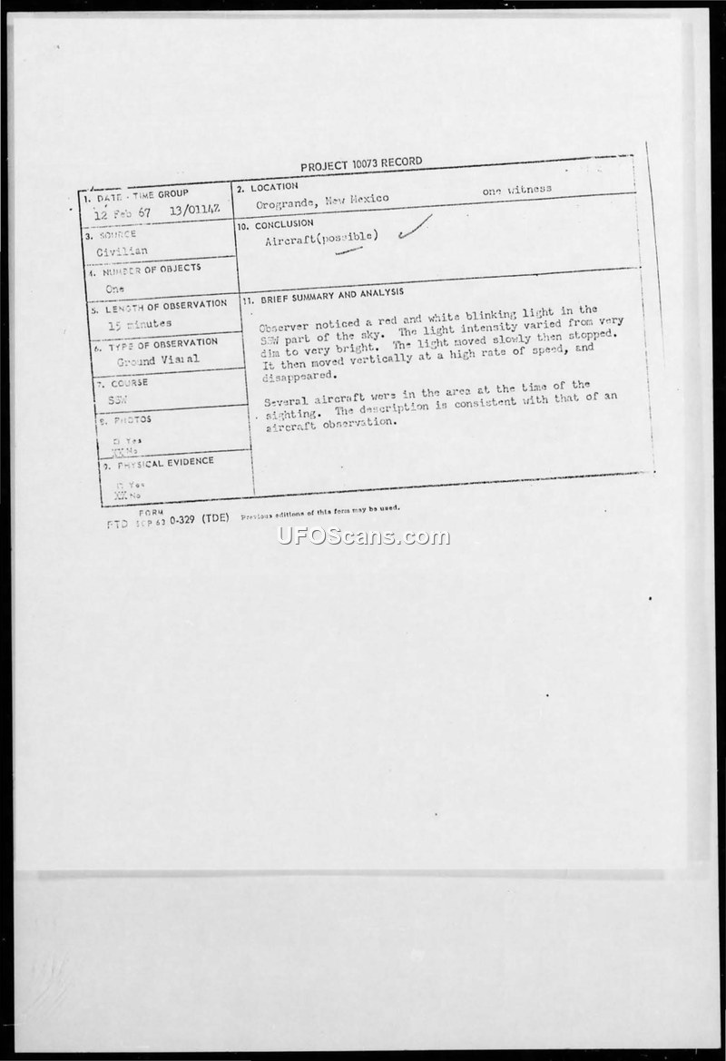 On February 12, 1967, at approximately 0114Z, a civilian witness—identified as an electronic technician at White Sands Missile Range—observed an unidentified aerial phenomenon while located on US Highway 54, 18 to 20 miles north of Orogrande, New Mexico. The witness reported seeing a red and white blinking light that varied in intensity from very dim to very bright. The object reportedly moved slowly, stopped, and then ascended vertically at a high rate of speed before disappearing. The observation lasted for 15 minutes. The Air Force investigated the incident under Project 10073. Official analysis noted that several aircraft were in the area at the time of the sighting and concluded that the description was consistent with an aircraft observation. A follow-up communication from the Foreign Technology Division, dated February 27, 1967, and signed by Colonel James C. Manatt, informed the witness that the initial report was insufficient for a full scientific evaluation and requested that the witness complete an FTD Form 164 for further analysis.