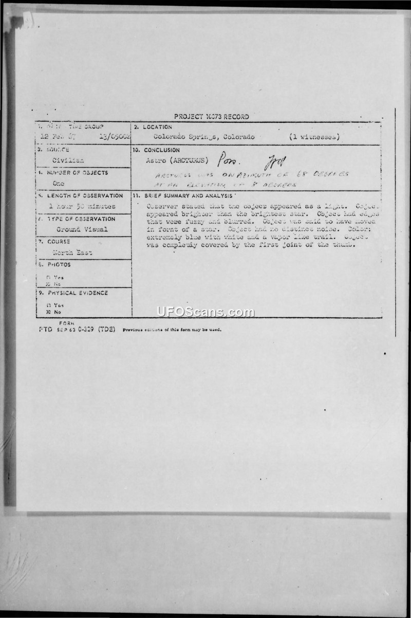 A 1967 UFO sighting report from Colorado Springs was investigated by the Air Force and identified as the star Arcturus.