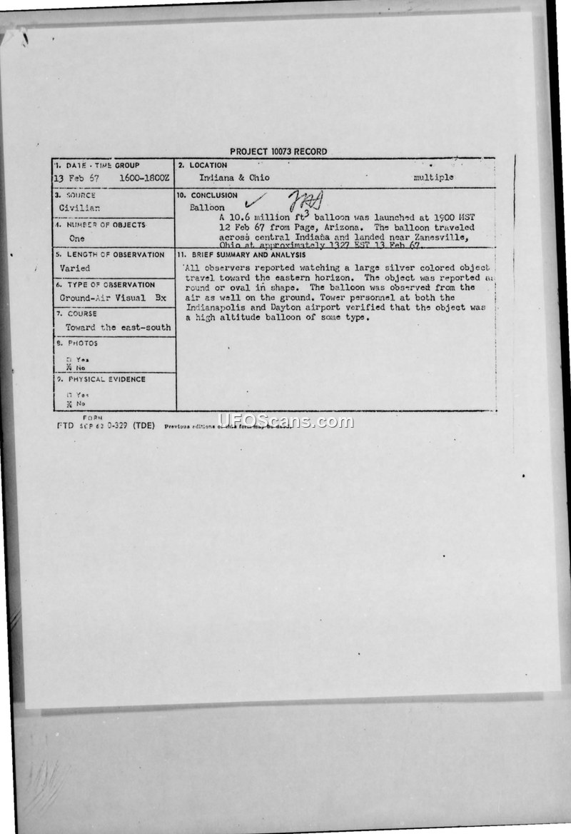Project 10073 Record: Balloon Sighting, Indiana & Ohio, 13 February 1967