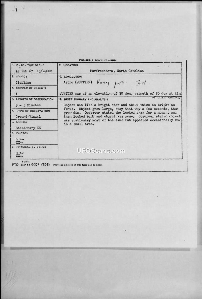A 15-year-old witness reported a stationary, bright object in the sky over Murfreesboro, NC, on February 14, 1967. The Air Force concluded the object was the planet Jupiter.