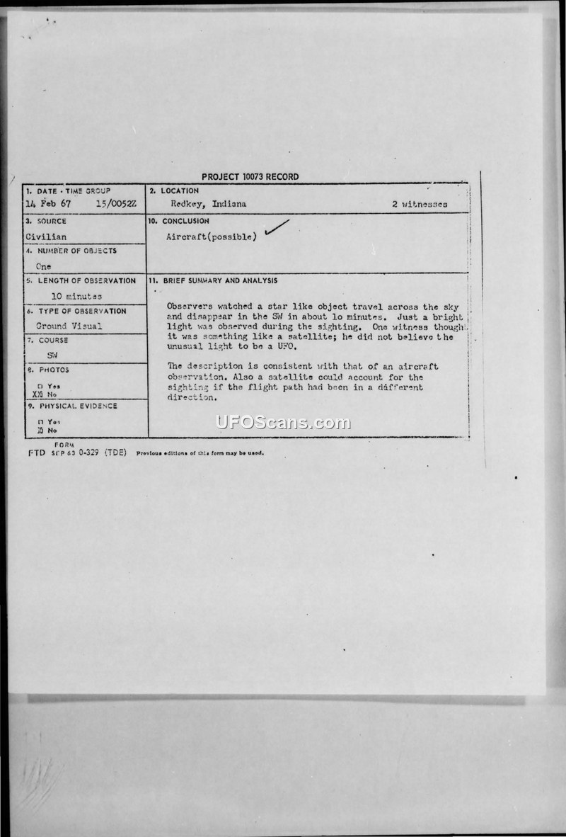 Project 10073 Record — Redkey, Indiana, 14 February 1967