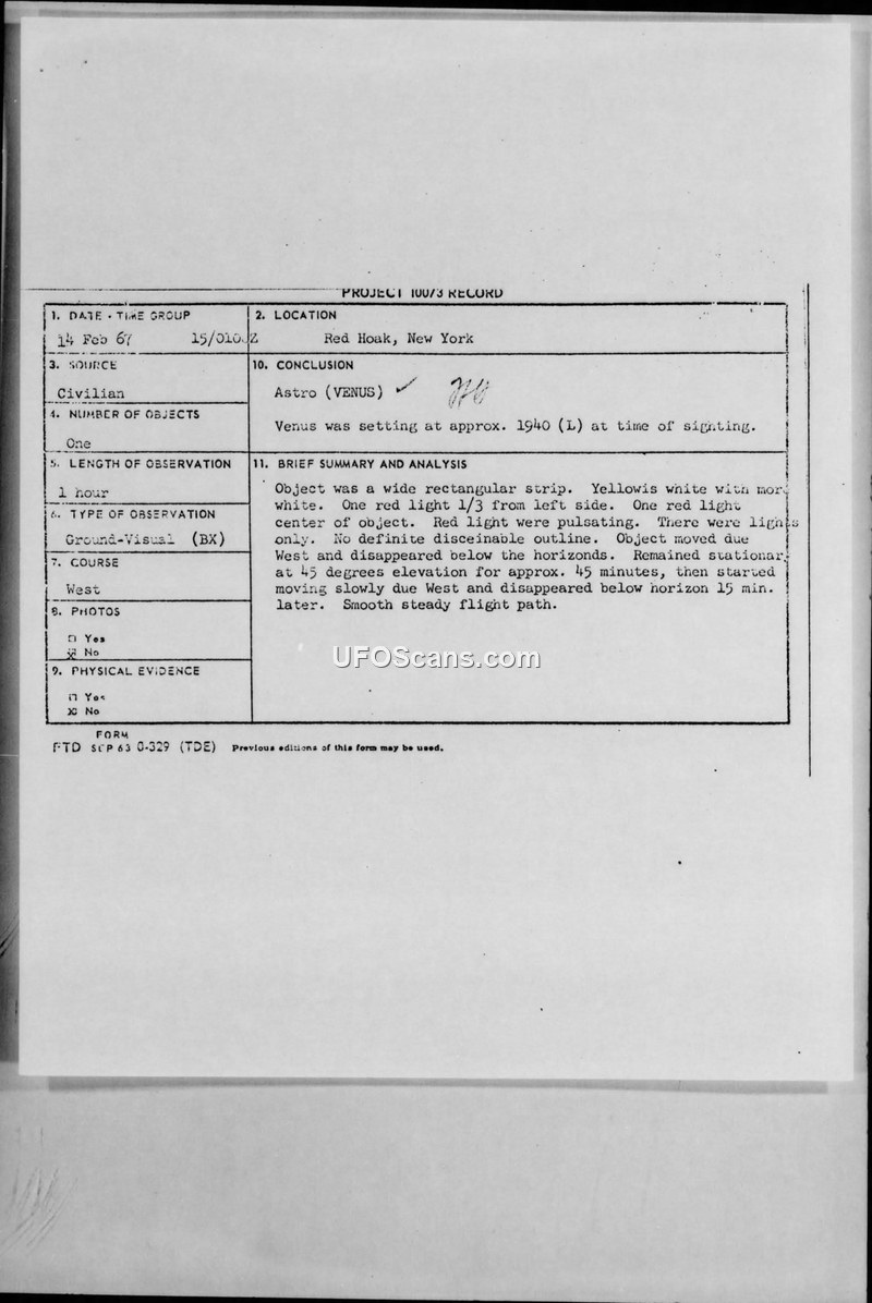 A civilian witness reported a rectangular object with pulsating lights near Red Hook, NY, on 14 February 1967. The USAF investigation concluded the object was the planet Venus.