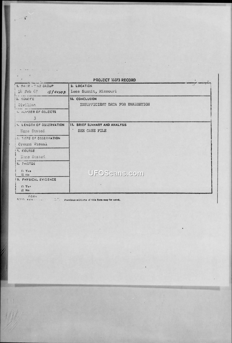 Project 10073 Record: UFO Observation, 14 Feb 67, Lees Summit, Missouri