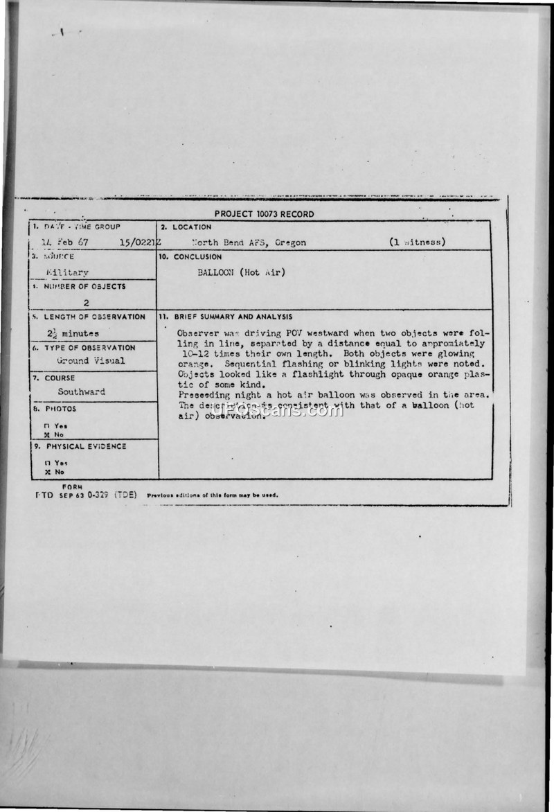 A 1967 report from North Bend AFS, Oregon, describes two glowing orange objects observed in the sky. The Air Force officially concluded the objects were hot air balloons.