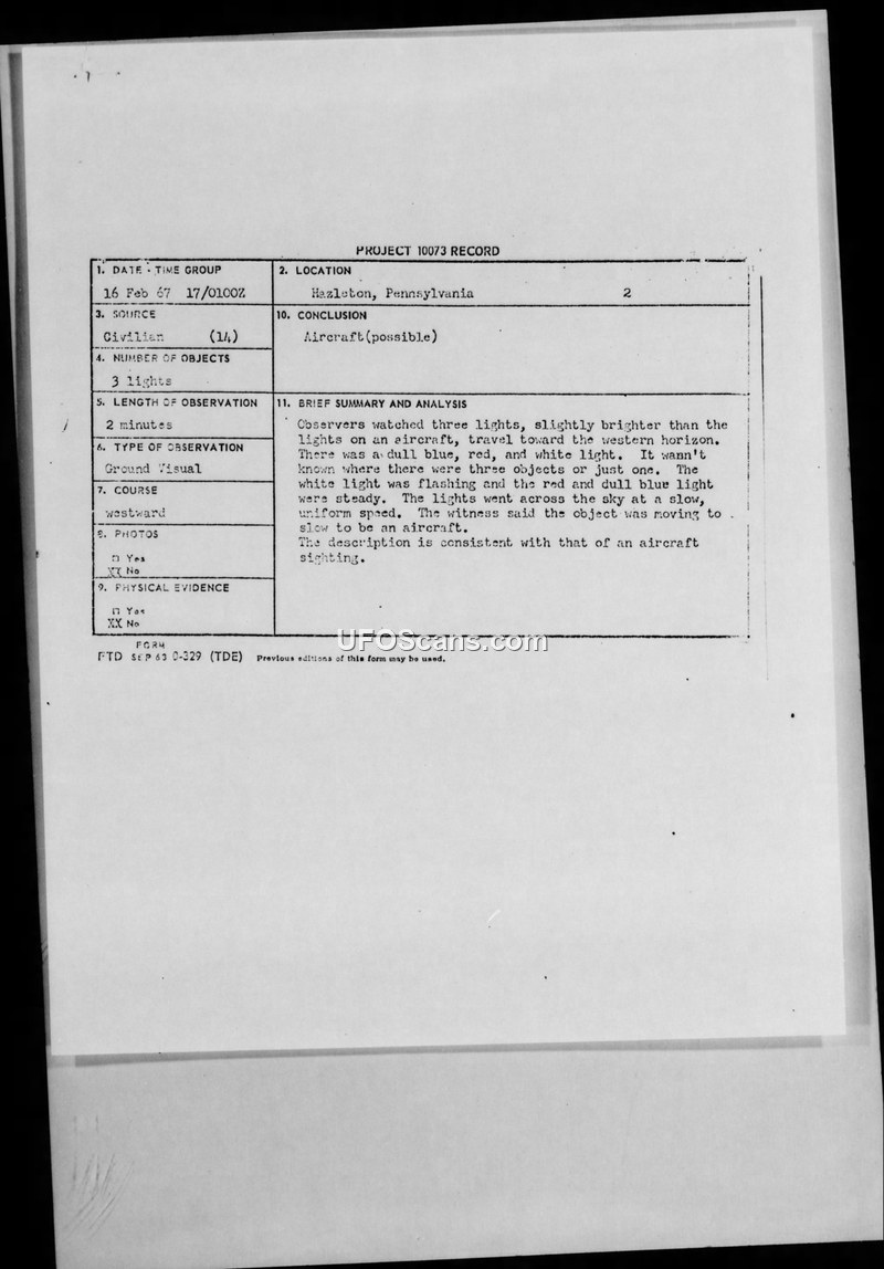 A 14-year-old witness in Hazleton, Pennsylvania, reported three silent, slow-moving lights on February 16, 1967. The U.S. Air Force concluded the sighting was possibly an aircraft.
