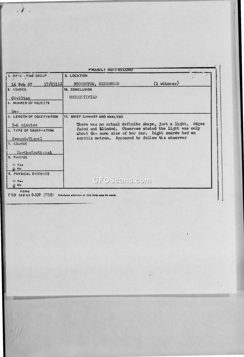 A 17-year-old student reported a bright, unidentified light pacing her vehicle near Stoughton, Wisconsin, on February 16, 1967. The Air Force investigated the incident but concluded the data was insufficient for a scientific explanation.