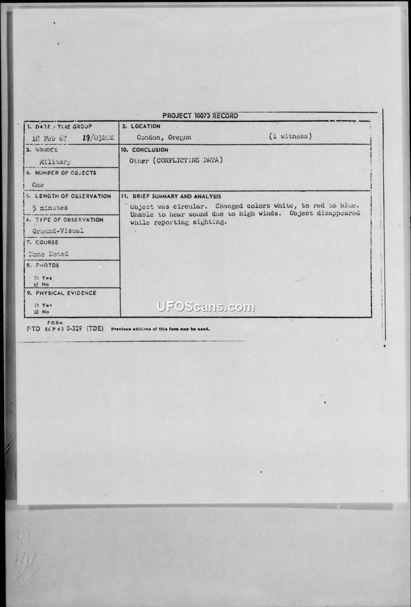 Project 10073 Record — Condon, Oregon, 18 Feb 67