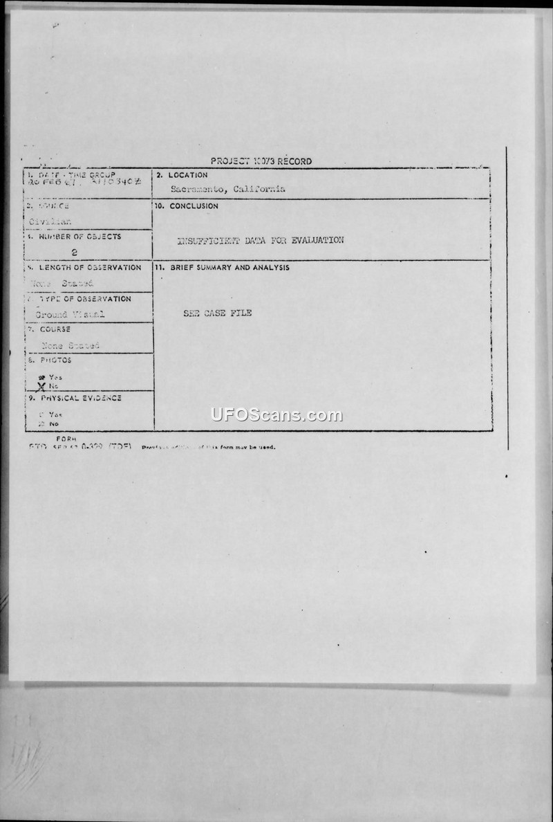 A 1967 UFO sighting report from Sacramento, California, involving two orange objects observed by a private pilot. The Air Force concluded the data was insufficient for scientific evaluation.