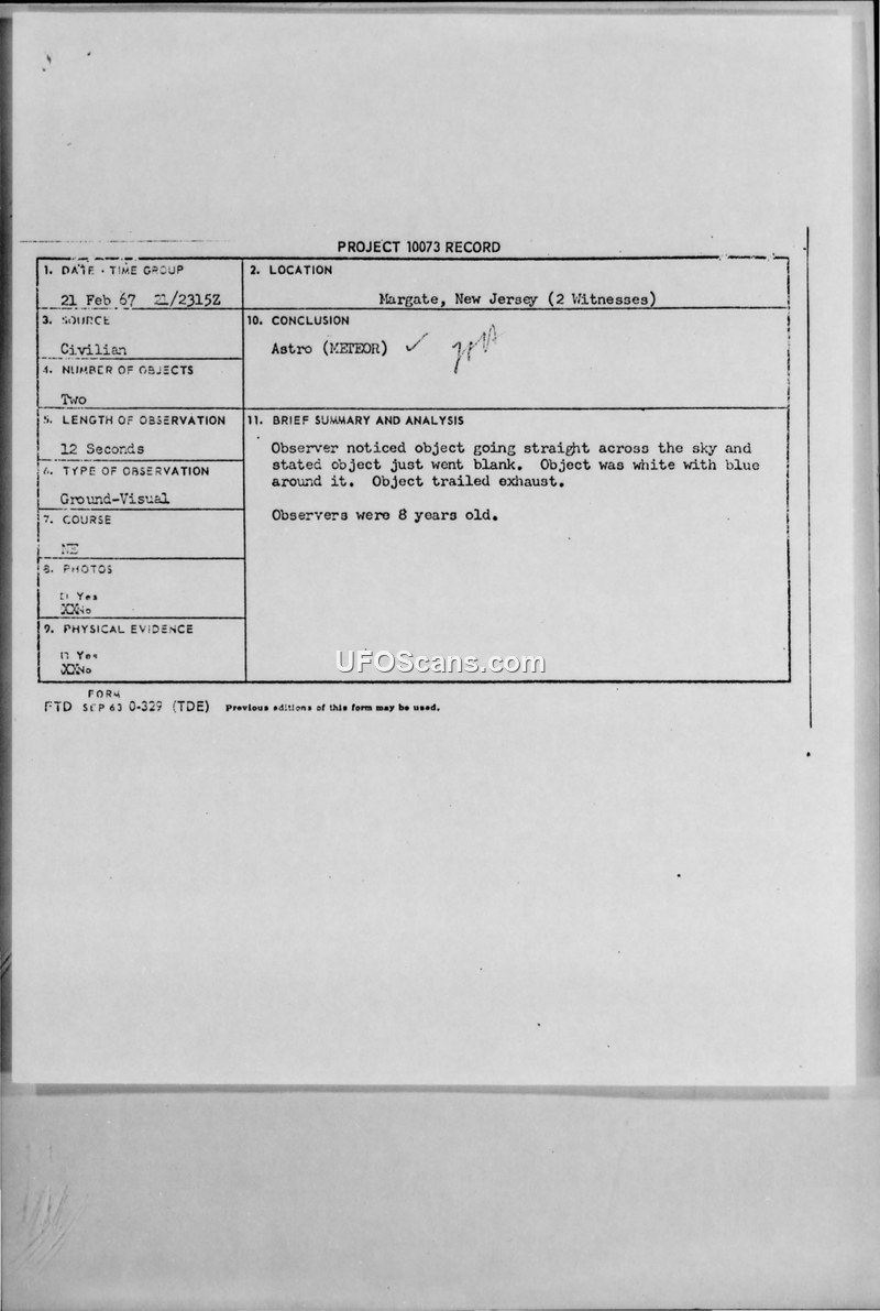 This document is a Project 10073 record detailing a sighting of an unidentified aerial phenomenon that occurred on February 21, 1967, in Margate, New Jersey. The report is based on the testimony of two witnesses, both of whom were eight years old at the time of the event. The witnesses observed two objects moving in a straight line across the sky for approximately 12 seconds before the objects suddenly disappeared. The objects were described as white in color with a blue aura and were noted to be trailing exhaust. The witnesses explicitly stated that there was no sound associated with the objects. The weather conditions at the time were reported as clear and dry. The witnesses indicated that they were inside a building when they observed the objects. The official conclusion recorded on the form by the U.S. Air Force is that the objects were meteors.