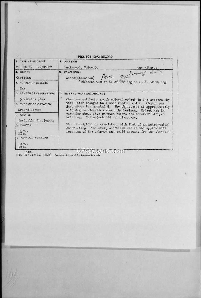 On February 21, 1967, at 0600Z, a civilian witness in Englewood, Colorado, reported observing an unidentified object in the western sky. The witness, a 42-year-old nurse, described the object as round and peach-colored, noting that it later shifted to a reddish hue. The object was observed for over five minutes, appearing to be basically stationary before moving southwest and then west toward the mountains. The witness stated that the object did not disappear during the observation. The report was processed by the Lowry Technical Air Training Center (ATC) of the United States Air Force. Major Edward E. Vigee, Chief of the Operations Services Division, reviewed the report. The official conclusion reached by the Air Force was that the sighting was an astronomical observation. Specifically, the star Aldebaran was calculated to be at an azimuth of 272 degrees and an elevation of 24 degrees, which the investigators determined could account for the reported phenomenon. The report notes that there was heavy air traffic in the Denver area at the time, and the investigator included a brief note regarding the 'possibility aircraft.' No physical evidence, photographs, or radar data were associated with the incident.