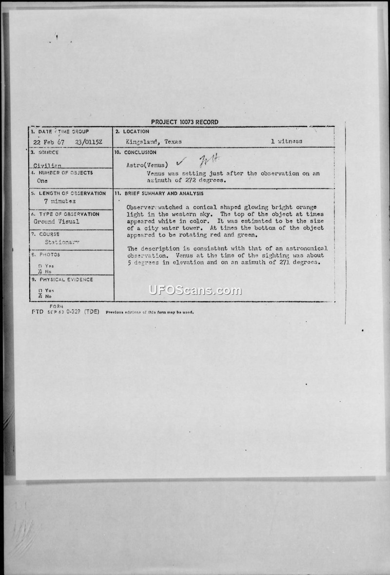 A civilian witness in Kingsland, Texas, reported a glowing conical object on 22 February 1967. The Air Force investigation concluded the object was the planet Venus, possibly in conjunction with a high-altitude weather balloon.