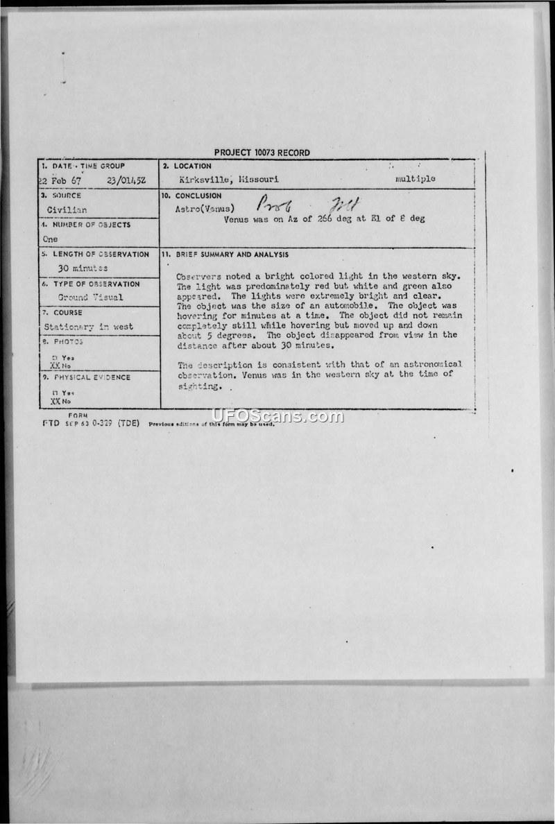 Project 10073 Records: UFO Sightings in Kirksville, Missouri (February 1967)
