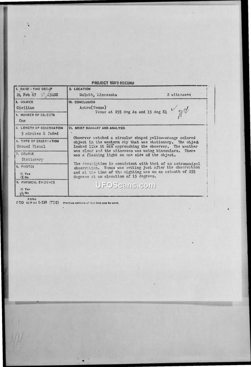 This document is a Project 10073 record detailing a UFO sighting reported in Duluth, Minnesota, on February 24, 1967. The primary witness, a 52-year-old welder at Clide Iron Works, observed a circular, yellow-orange object in the western sky for approximately five minutes. The witness used seven-power binoculars to view the object, which appeared stationary but seemed to approach the observer. The object was described as having a flashing light on one side and being the size of a dime at arm's length. The observer and his wife reported seeing the object on three consecutive nights. The official Air Force conclusion identified the object as the planet Venus, noting that the planet was setting at the time of the observation at an azimuth of 255 degrees and an elevation of 15 degrees. The report mentions that the observer's daughter took black and white photographs of the object, which were to be sent for follow-up analysis. Weather conditions at the time were reported as clear with unlimited visibility and an atmospheric inversion present.