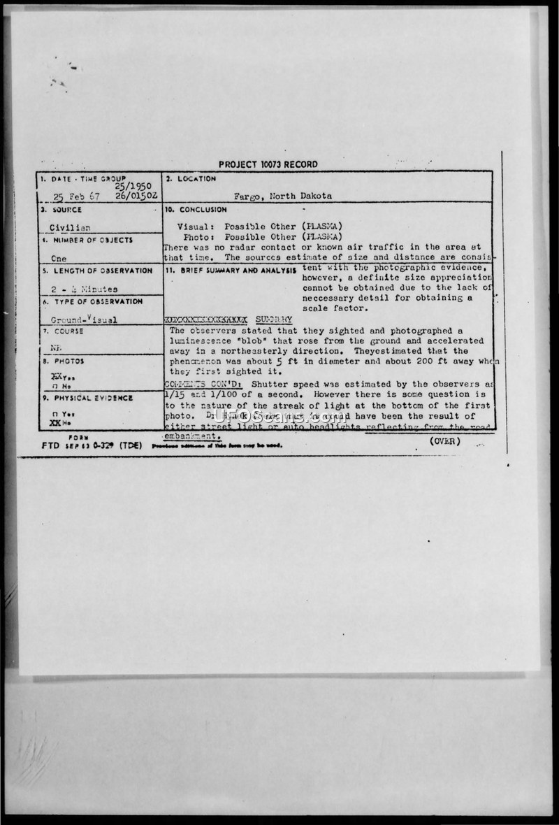 Project 10073 Record: UFO Sighting, Fargo, North Dakota, 25 February 1967