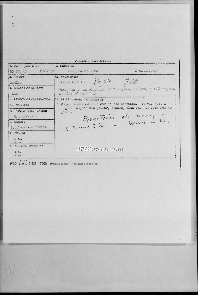 A 12-year-old witness reported a 20-minute UFO sighting in Pennsylvania on February 26, 1967. The Air Force investigated the report and officially concluded the object was the planet Venus.