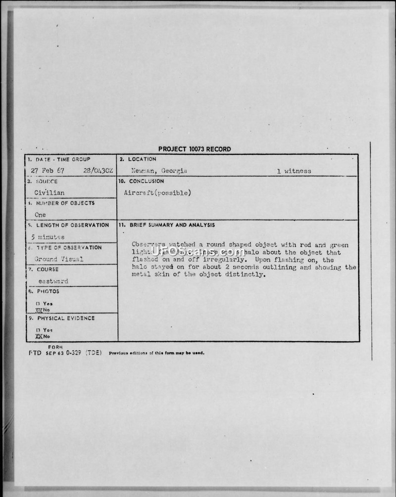 Project 10073 Record — Newnan, Georgia, 27 February 1967