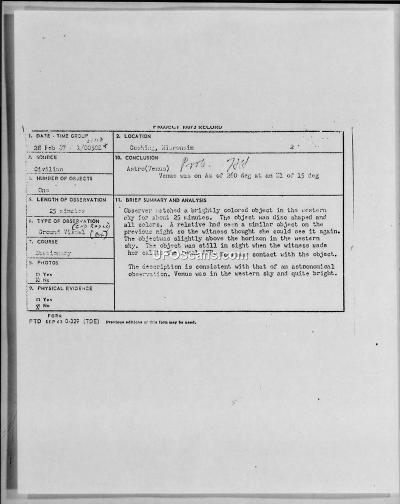 A civilian in Cushing, Wisconsin, reported a disc-shaped UFO in February 1967. The Air Force investigated and concluded the sighting was likely the planet Venus.