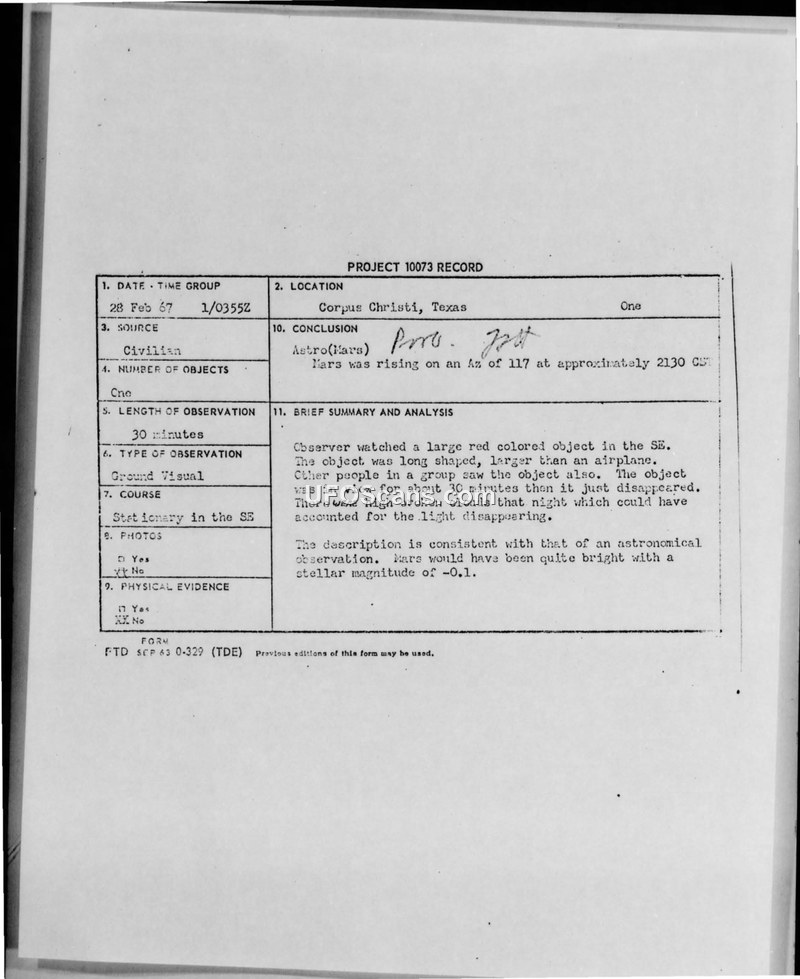 A 1967 UFO sighting report from Corpus Christi, Texas, involving a group of observers. The Air Force concluded the object was the planet Mars.