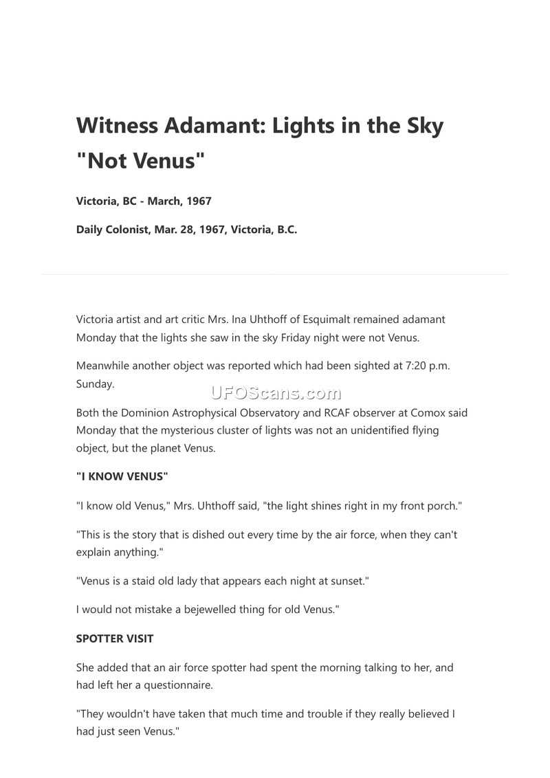This newspaper article from the Daily Colonist, dated March 28, 1967, reports on a sighting of mysterious lights in the sky over Victoria, British Columbia. Mrs. Ina Uhthoff, a local artist and art critic, reported seeing lights on a Friday night and remained adamant that they were not the planet Venus, despite official claims to the contrary. The Dominion Astrophysical Observatory and an RCAF observer at Comox both identified the lights as the planet Venus. Mrs. Uhthoff expressed skepticism regarding the official explanation, noting that she was familiar with the appearance of Venus and that the object she observed was distinct. She mentioned that an air force spotter had visited her to discuss the sighting and provided her with a questionnaire. Mrs. Uhthoff suggested that the air force would not have invested time in such an investigation if they truly believed the sighting was merely Venus. She further speculated that the sighting might be related to atmospheric conditions, noting that the atmosphere was thick on the night of the sighting and that she had previously observed optical phenomena such as ships appearing to sail upside down in the straits during the summer.