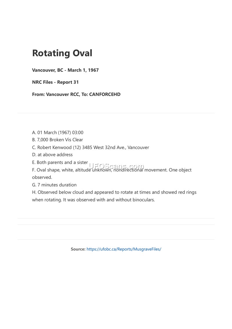 On March 1, 1967, at 03:00, a sighting of an unidentified aerial phenomenon occurred in Vancouver, British Columbia. The report, filed as Report 31 within the NRC Files, originated from the Vancouver Rescue Coordination Centre (RCC) and was directed to CANFORCEHD. The primary witness was 12-year-old Robert Kenwood, who observed the event alongside his parents and a sister from their residence at 3485 West 32nd Avenue. The weather conditions at the time were reported as 7,000 feet broken clouds with clear visibility. The witnesses observed a single white, oval-shaped object for a duration of seven minutes. The object exhibited nondirectional movement and was observed below the cloud layer. According to the report, the object appeared to rotate at times, during which it displayed red rings. The observation was conducted both with and without the use of binoculars.