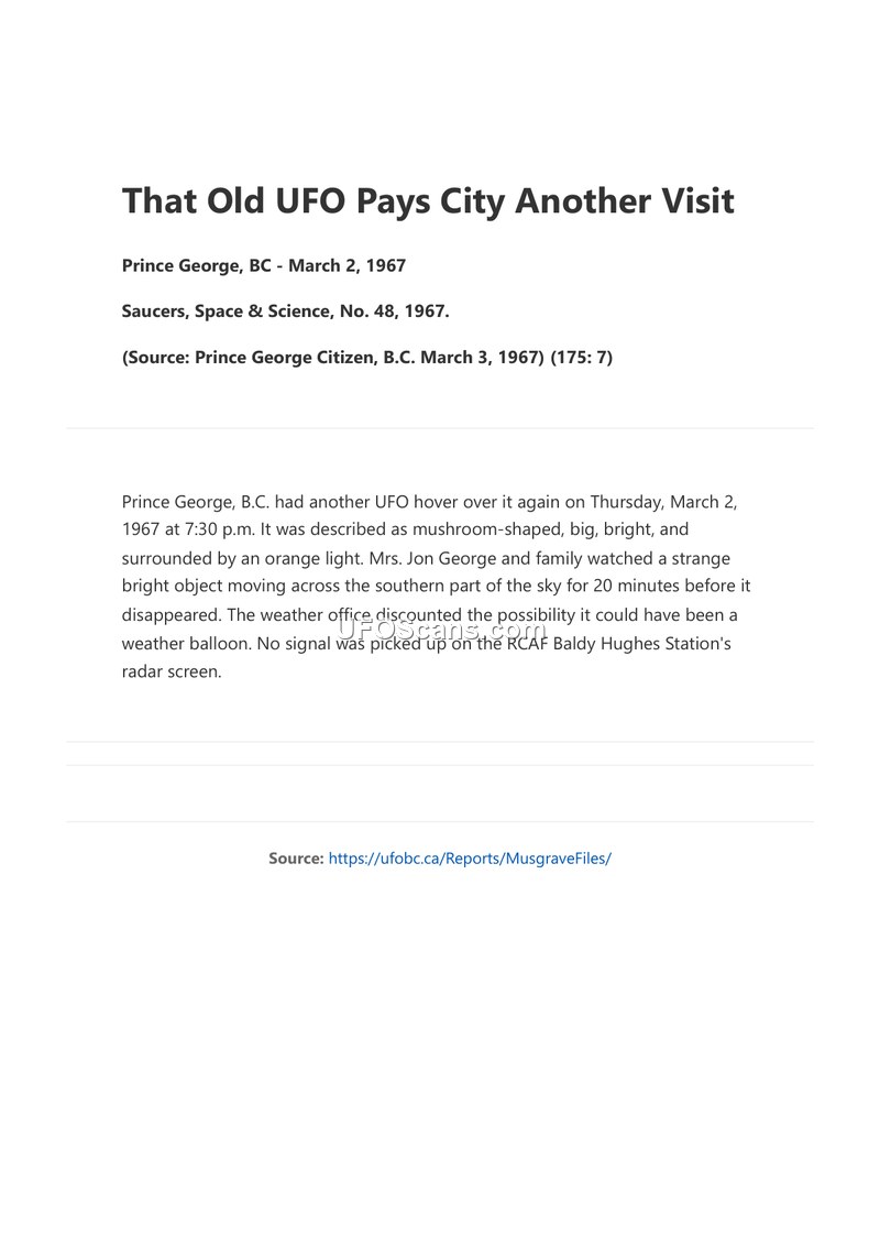 A family in Prince George, B.C., observed a mushroom-shaped, orange-lit UFO for 20 minutes on March 2, 1967. The RCAF radar station in the area reported no corresponding contact.