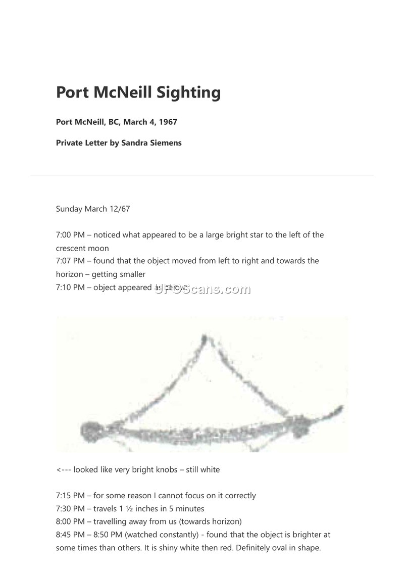 A private letter from Sandra Siemens reporting a multi-hour UFO sighting in Port McNeill, BC, on March 4, 1967. The object was described as oval, changing color between white and red, and was also observed by other witnesses in Sointula.
