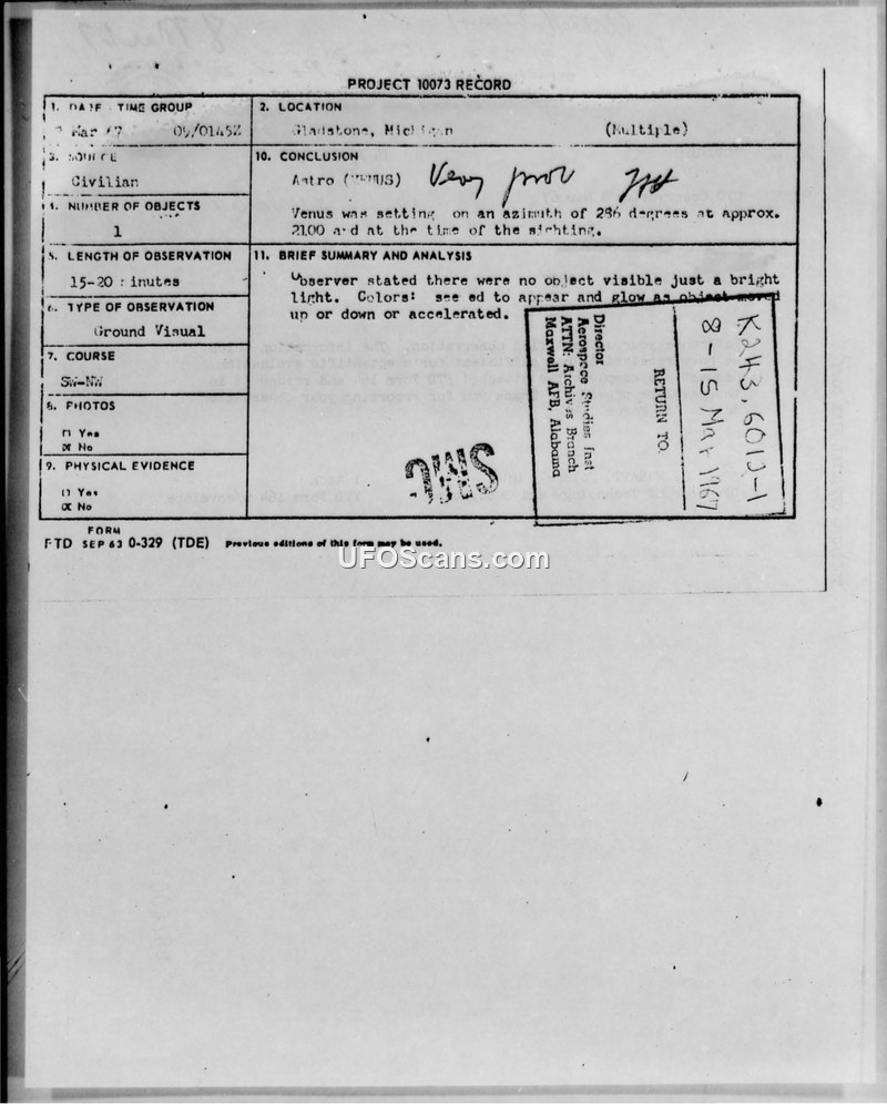 Project 10073 Record — Sighting in Gladstone, Michigan, March 8, 1967