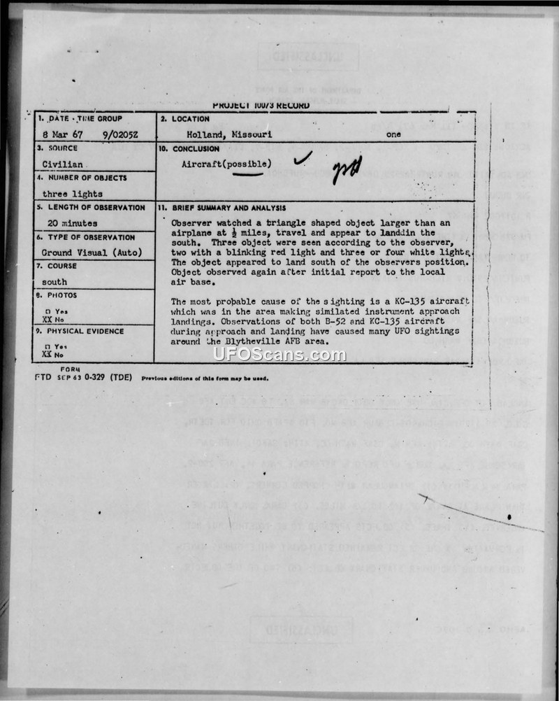 On 8 March 1967, a 16-year-old grocery store employee in Holland, Missouri, reported observing a triangle-shaped object larger than an airplane. The witness, who was driving on Highway 61, described the object as having a blinking red light and three or four white lights. The object reportedly remained stationary while two other objects maneuvered around it. The sighting lasted approximately 20 minutes. The witness later provided an 8mm film of the event to the 97th Combat Support Group at Blytheville Air Force Base. The film was forwarded to the Foreign Technology Division at Wright-Patterson Air Force Base for analysis. Photographic analysis concluded that the film was essentially blank, containing only two small, circular bright spots, and provided no evidence of the object. The Air Force concluded that the most probable cause of the sighting was a KC-135 aircraft from the 97th Air Refueling Squadron, which was conducting simulated instrument approach landings in the area at the time. The report notes that observations of B-52 and KC-135 aircraft during approach and landing have caused many UFO sightings around the Blytheville AFB area. The witness was informed by the Office of Information in May 1967 that the film did not contain photography of the object and that the film was being returned.