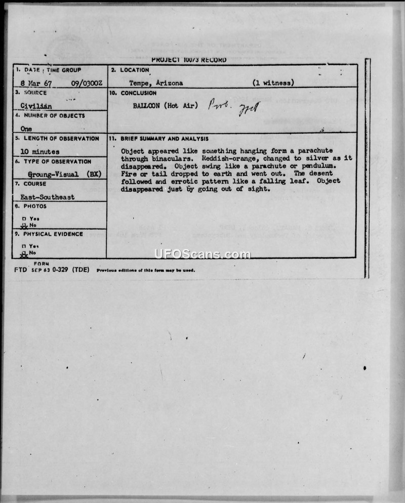 On March 8, 1967, a retired Navy Commander and professional entomologist observed an unidentified aerial phenomenon over Tempe, Arizona. The witness, who had over 30 years of professional research experience, initially spotted a bright light that he compared to a satellite. Upon using 10x50 binoculars, he observed that the object consisted of four distinct light sources arranged in a group, resembling the open end of an old kerosene stove. The object appeared to swing like a pendulum and exhibited an erratic, falling-leaf descent pattern. As the object moved from the northwest toward the east-southeast, it changed color from reddish-orange to silver. The witness noted that fire or burning material dropped from the object toward the earth and extinguished. The object eventually disappeared from sight after approximately 10 to 15 minutes. The witness reported the incident to the Air Force, and was subsequently interviewed by Captain C.J. Redding. The official conclusion reached by the Foreign Technology Division was that the object was a hot air balloon, possibly an experiment involving candles on a suspended platform, which would account for the light diffusion observed through the balloon's material. The witness noted that he had recently read an article about students in the Los Angeles area constructing hot air balloons, which may have influenced local activity.
