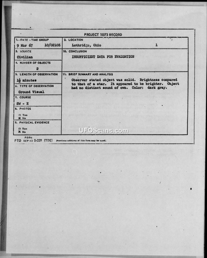 Project 10073 Record — Lothridge, Ohio, 9 March 1967