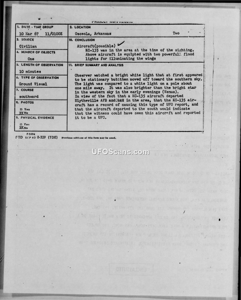 A civilian in Osceola, Arkansas, reported a bright white light in the sky on March 10, 1967. The Air Force concluded the object was likely a KC-135 tanker aircraft from Blytheville AFB using its wing-illumination floodlights.