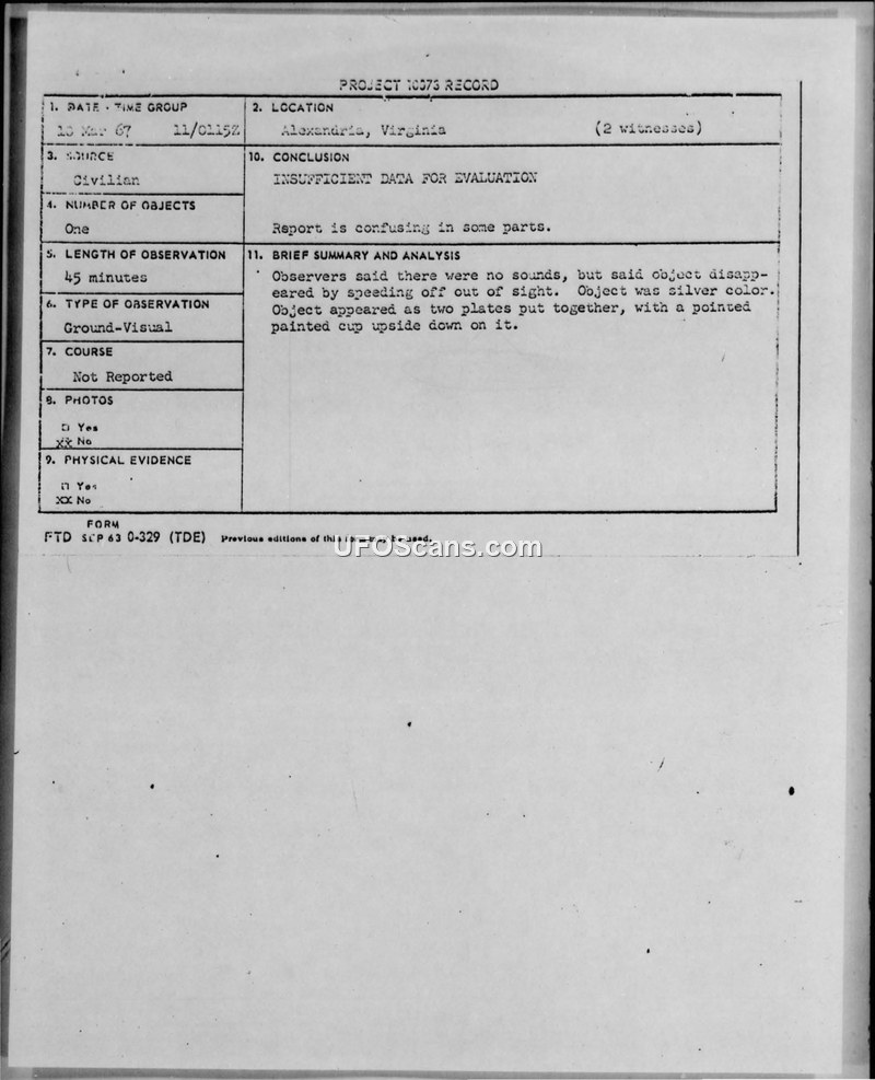 A 13-year-old witness reported a silver, plate-like object in Alexandria, Virginia, on March 10, 1967. The Air Force concluded there was insufficient data for evaluation.
