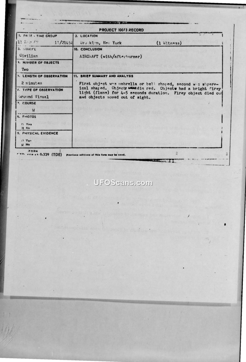 PROJECT 10073 RECORD - 11 March 1967 Sighting, Brooklyn, New York